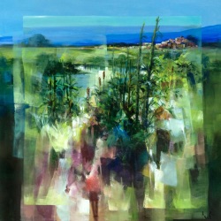 The 80's comprised a second period of active experimentation in Piccoli's career. He investigated new mediums and sought new ways of weaving together the major strands of his style, realism and abstraction, visual detail and imagination. Variously, he tried impressionism, expressionism, and fauvism. Within ten years, he had found a definite direction toward the synthesis he was seeking. His colors became brighter, his brushwork more free. Soon he began adding patches of pure abstraction as a sort of "out-of -focus" overlay in front of the pure landscape. These patches serve as a visual relief from the strongly geometric architectural forms. In his most recent works, the subject matter has become incorporated into the abstraction.